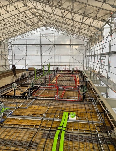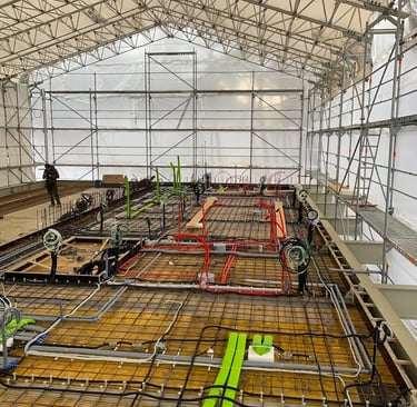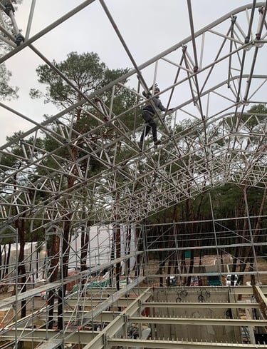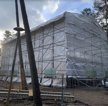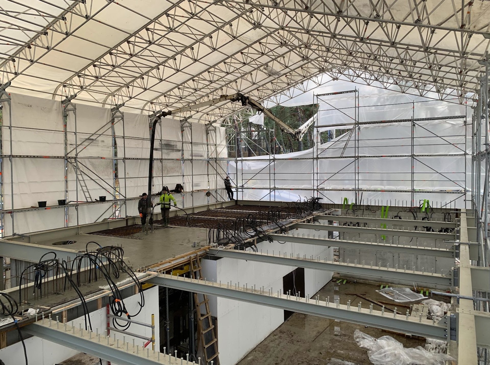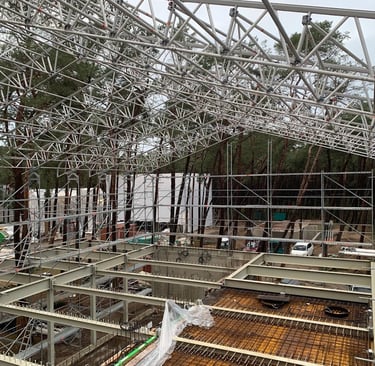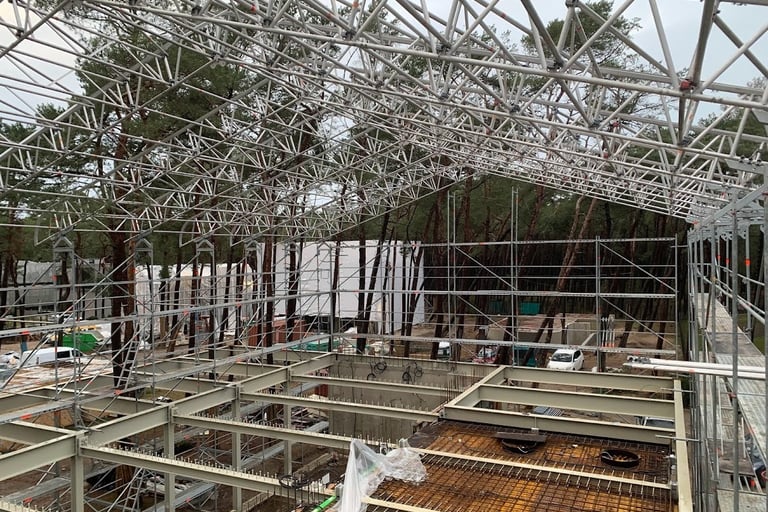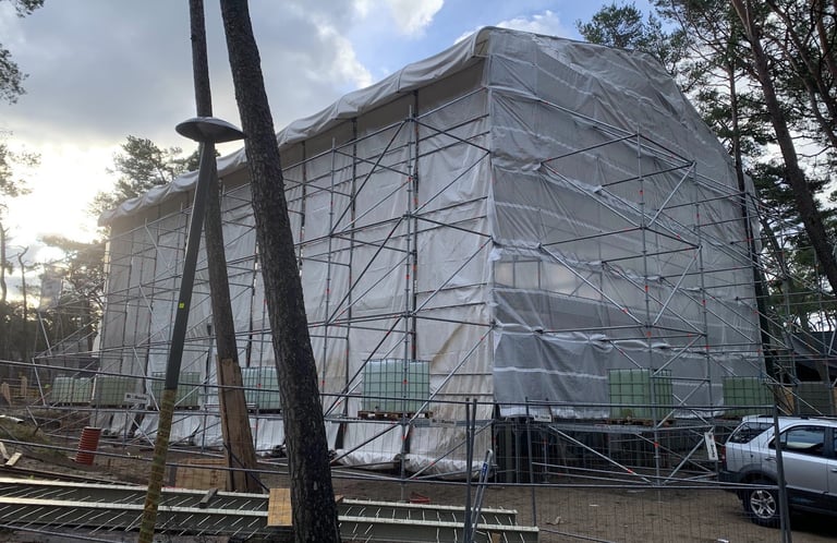 The new building construction in Giruliai utilized the advanced Layher scaffolding system for its flexibility, safety, and efficiency. To protect the structure from weather, special sheeting covered the scaffolding, allowing work to continue uninterrupted by rain or snow. This ensured that construction proceeded on schedule, with all areas of the building easily accessible throughout the project.